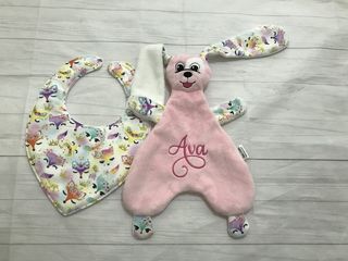 Choose fabrics you want snuggly made in from the cotton and minky albums. Puppy Snuggly comes with a snap on one ear for you to attach a dummy/pacifier or teether to.
