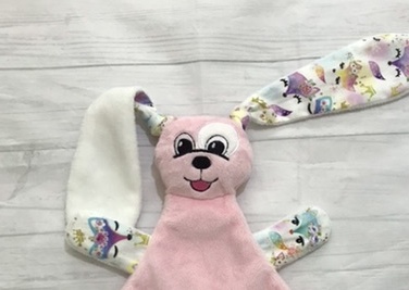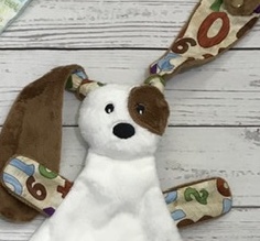 Choose fabrics you want snuggly made in from the cotton and minky albums. Puppy Snuggly comes with a snap on one ear for you to attach a dummy/pacifier or teether to.
